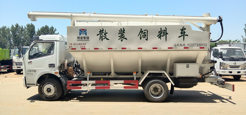 散裝飼料運輸車,散裝飼料車的飼料罐架設在卡車的底盤上,罐頂開有進料口.頂部的一根螺旋輸送卸料管(俗稱卸料絞龍)則可自由回轉和抬升,抬升的仰角可達60度。運輸時,頂部的螺旋管平臥在罐頂;卸料時則抬起,使管端的出料口與畜禽飼養(yǎng)場貯料罐頂部的進料門相接,駕駛室內裝有操縱裝置(操縱裝置也可裝置在罐體尾部),卸料時通過車底的動力輸出軸和減速器來驅動螺旋,以完成卸料。
