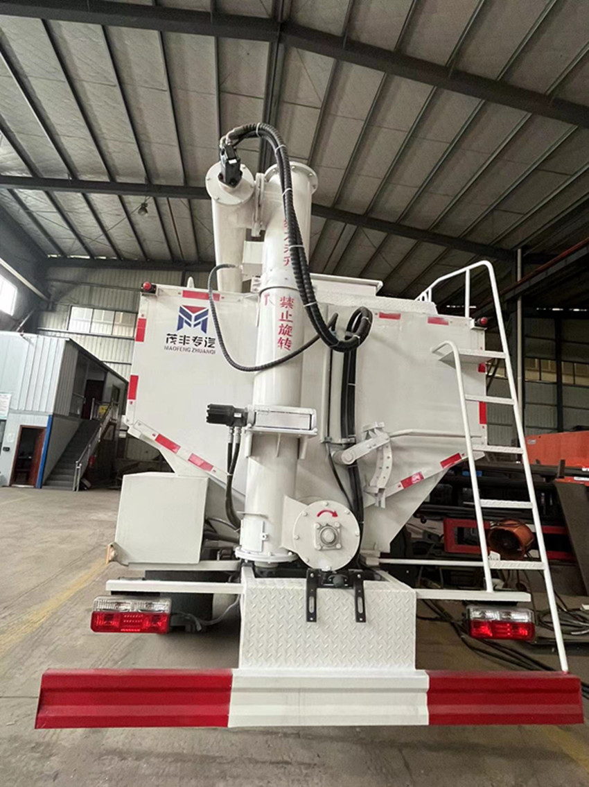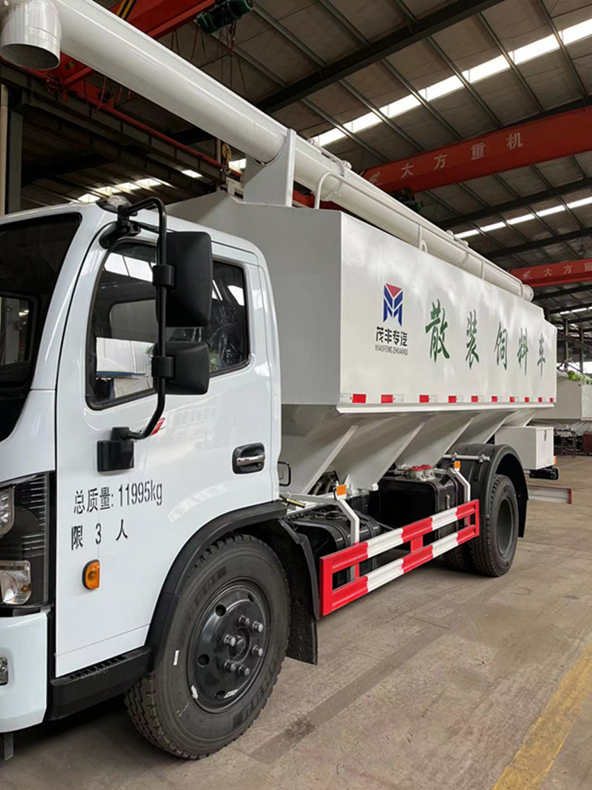 散裝飼料運輸車,散裝飼料車的飼料罐架設(shè)在卡車的底盤上,罐頂開有進(jìn)料口.頂部的一根螺旋輸送卸料管(俗稱卸料絞龍)則可自由回轉(zhuǎn)和抬升,抬升的仰角可達(dá)60度。運輸時,頂部的螺旋管平臥在罐頂;卸料時則抬起,使管端的出料口與畜禽飼養(yǎng)場貯料罐頂部的進(jìn)料門相接,駕駛室內(nèi)裝有操縱裝置(操縱裝置也可裝置在罐體尾部),卸料時通過車底的動力輸出軸和減速器來驅(qū)動螺旋,以完成卸料。